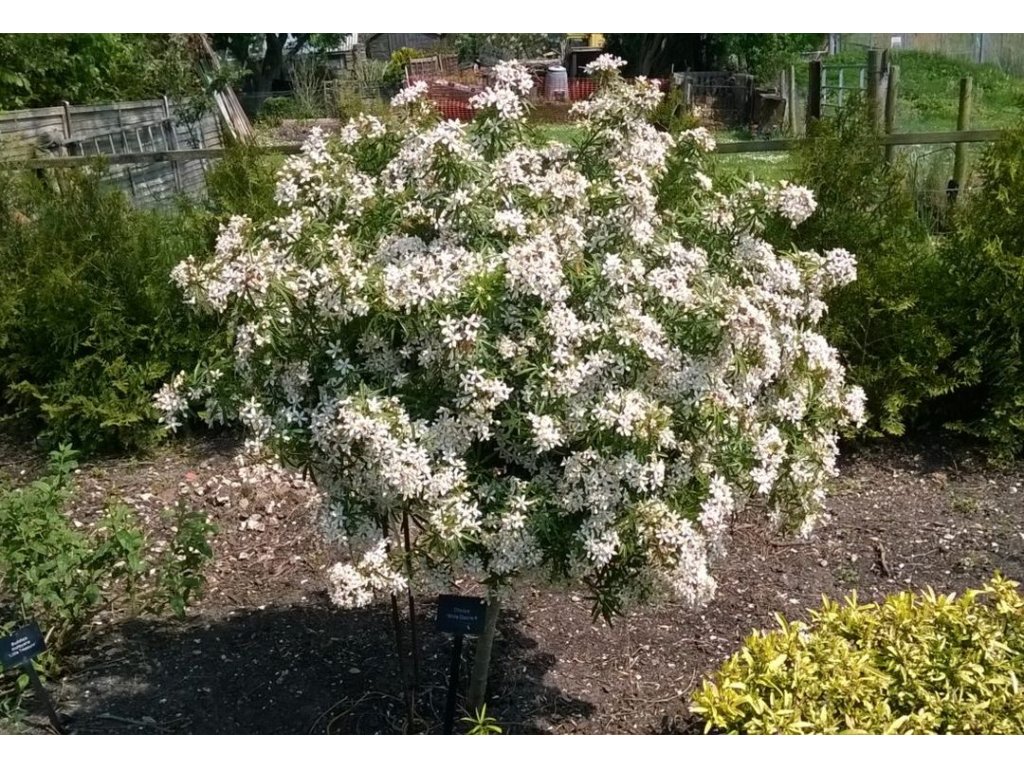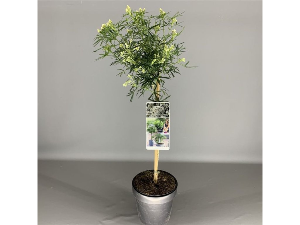 Tato rostlina je roubována na kmínku ve výšce 50 cm, díky čemuž získává noblesní, stromkový charakter. Převislá, kulovitá korunka plná jemného listí a vonných květů působí jako živá dekorace – na terase, u vchodu do domu nebo jako solitér v záhonu. 'White Dazzler' je zkrátka rostlina, která zaujme po celý rok.