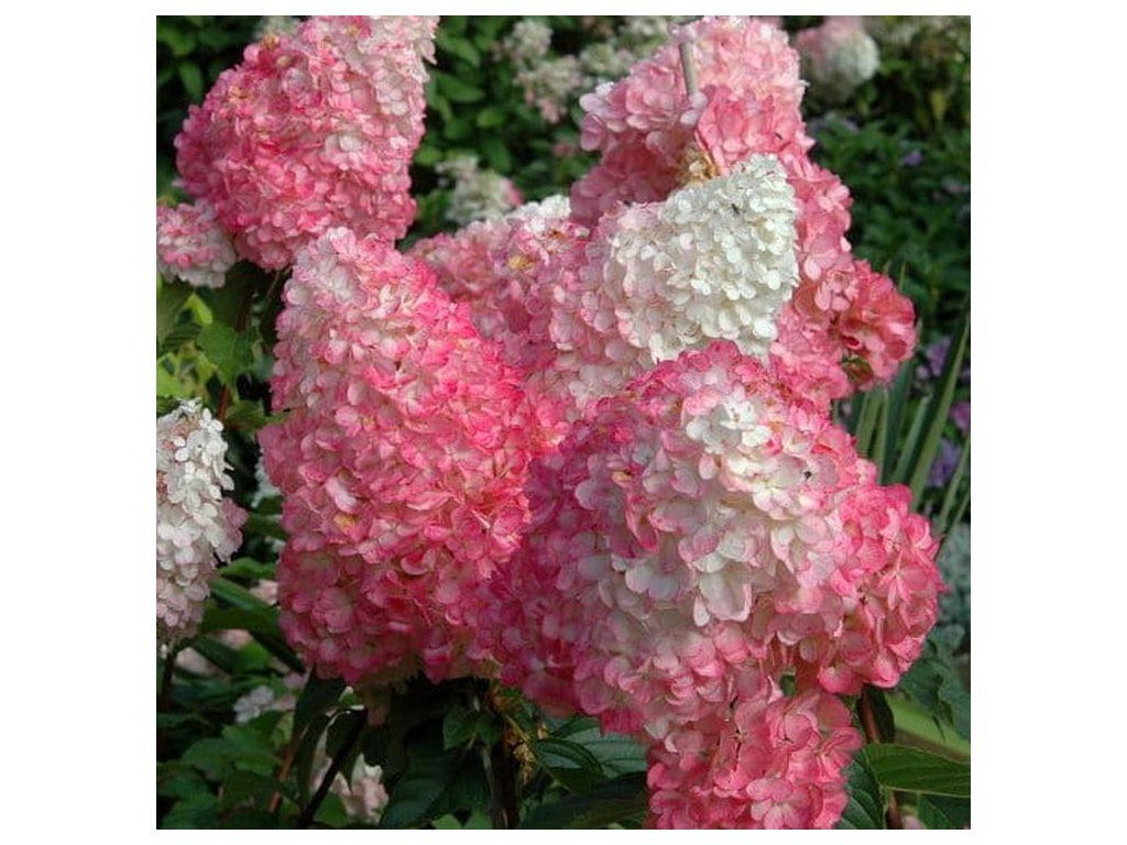 Hortenzie latnatá 'Pink Diamond'® s fascinující barevnou proměnou – kuželovitá květenství začínají krémově bílá a rychleji než u jiných kultivarů přecházejí do sytě malinově růžové, téměř červené. Plně mrazuodolná, nenáročná, skvělá do záhonu i terasy.