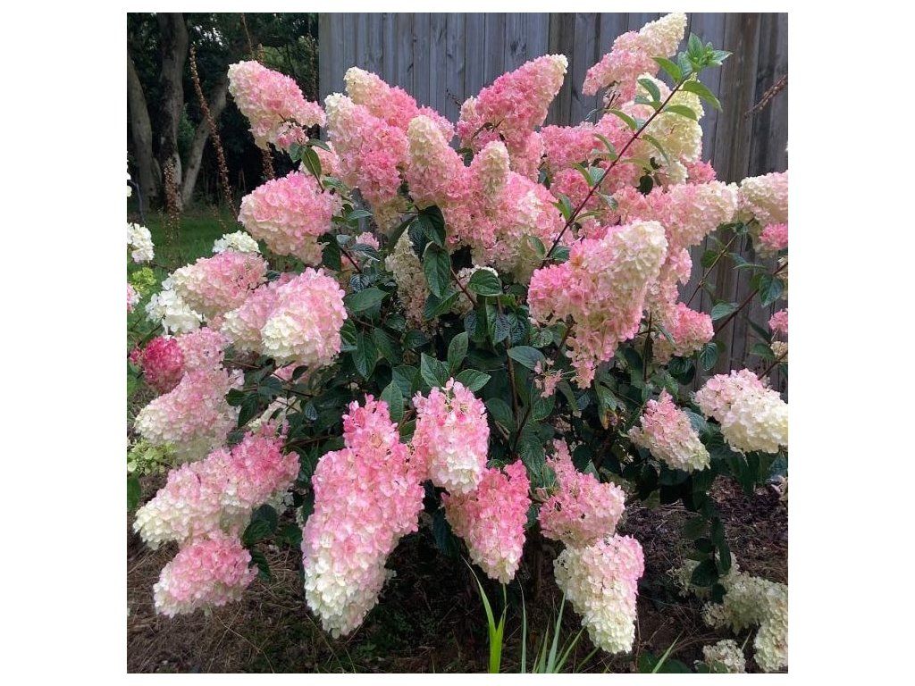 Hortenzie latnatá 'Sundae Fraise' s romantickou barevnou proměnou – kuželovitá květenství začínají čistě bílá, postupně přecházejí přes krémovou až do sytě jahodo-růžové. Kompaktní, plně mrazuodolná, nenáročná. Skvělá do záhonu i na terasu.