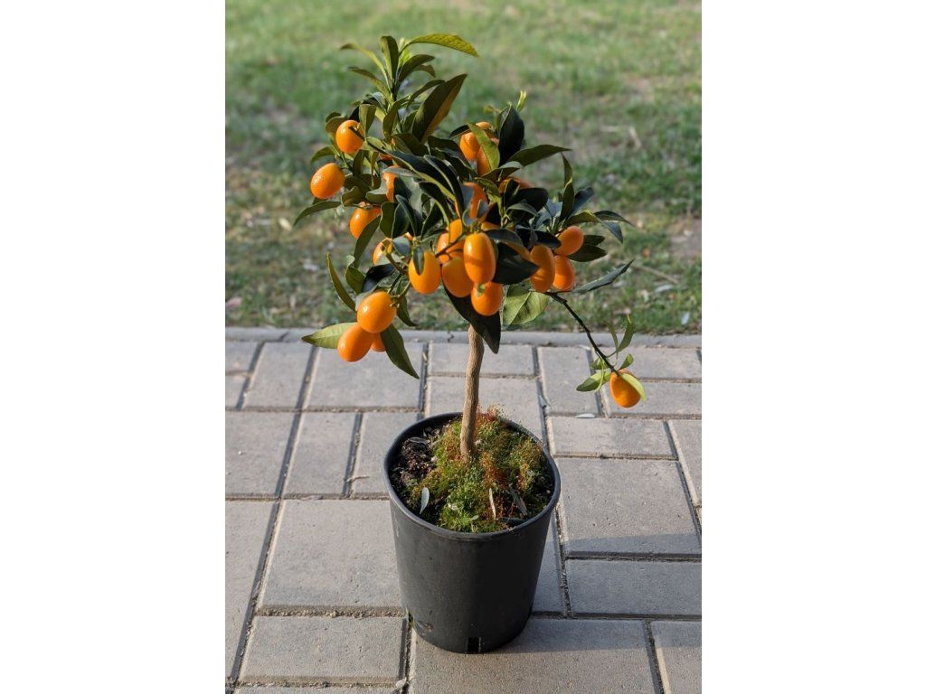 Kumquat je stálezelený a pravidelně kvete – bílé vonné kvítky voní po citrusech a střídají zelené a dozrávající oranžové plody. Oproti citroníku je kumquat o něco odolnější vůči chladu, přesto jej v našich podmínkách pěstujeme jako přenosnou nádobovou rostlinu. Rostlina je dodávána ve květináči o průměru 20 cm, výška rostliny cca 50 cm.