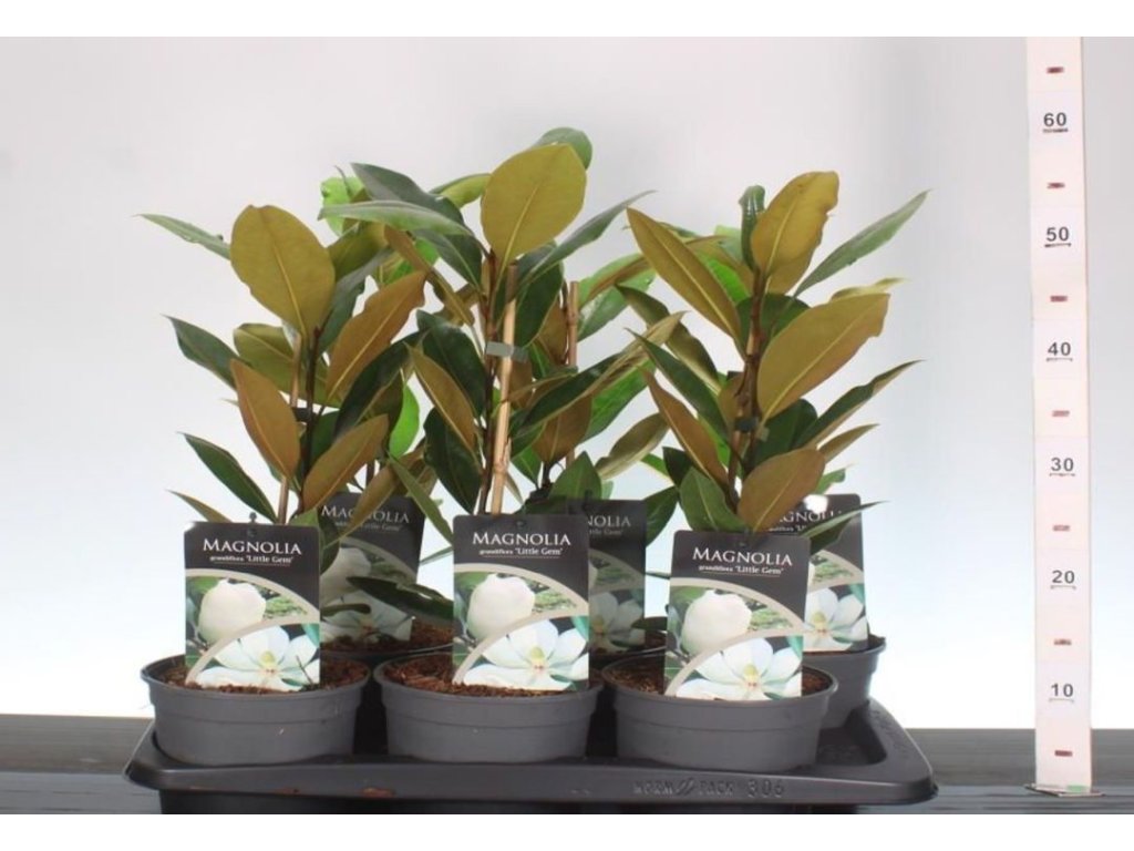 Magnolia grandiflora 'Little Gem' je kompaktní, věčně zelená magnolie s velkými krémově bílými květy a intenzivní vůní. Kvete opakovaně od června do října, a to již od mladého věku. Tmavozelené kožovité listy s rezavým rubem zdobí zahradu po celý rok. Vhodná jako solitér, do živého plotu i do nádoby na terase. Preferuje slunné až polostinné stanoviště a propustnou, mírně kyselou půdu. Mrazuvzdornost až –15 °C .