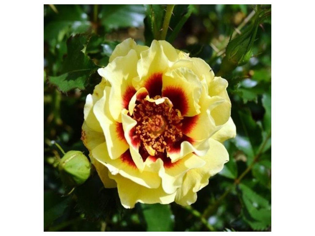 Růže 'Babylon Eyes'® – fascinující hybrid perské růže se žlutými jednoduchými květy s výrazným tmavě červeným okem uprostřed. Každý květ připomíná exotický vzor – žádná jiná růže nevypadá takto. Kvete nepřetržitě od května do listopadu, kompaktní, mrazuodolná.